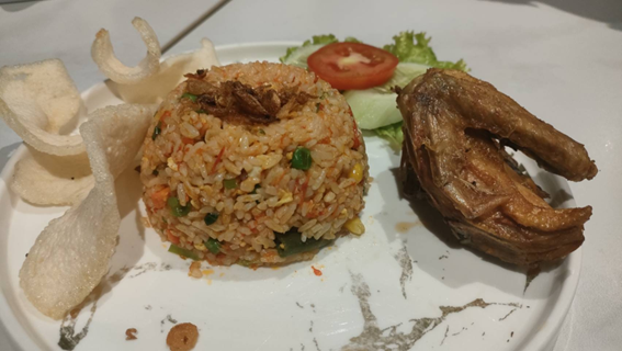 頼んだのは、レッドチリチキンライスという、ご飯と焼いたチキンレッグに野菜とえびせんべいが添えられた料理でした。事前に辛い食べ物が多いと聞いていたものの、チキンは塩コショウでさっぱりと味付けされており、食べやすく油断してしまいました。本当に辛かったのはライスやソースで、口に運んだ瞬間、刺されたかのような辛さを感じ、口々に「辛い!痛い!」と言いながら食べました。後にバディに聞いたところ、先述のえびせんと一緒に食べることで辛さを軽減できるとのことでした。