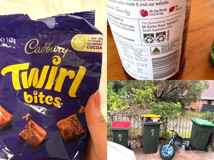 左から、環境保護や児童労働撲滅を目的としたプログラム「カカオ・ライフ」のロゴが表示された人気のチョコレート、リサイクル表示の例、リサイクルごみ・コンポスト用のごみ・その他のごみに分別されたゴミ箱。