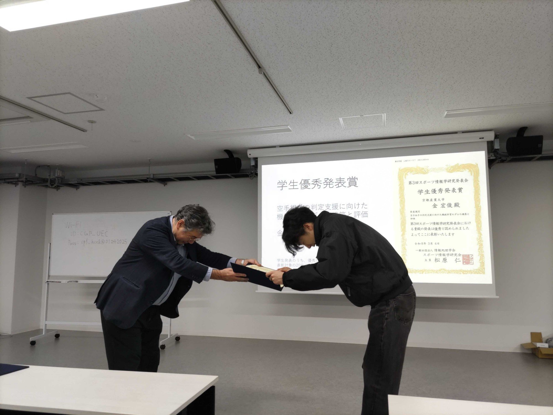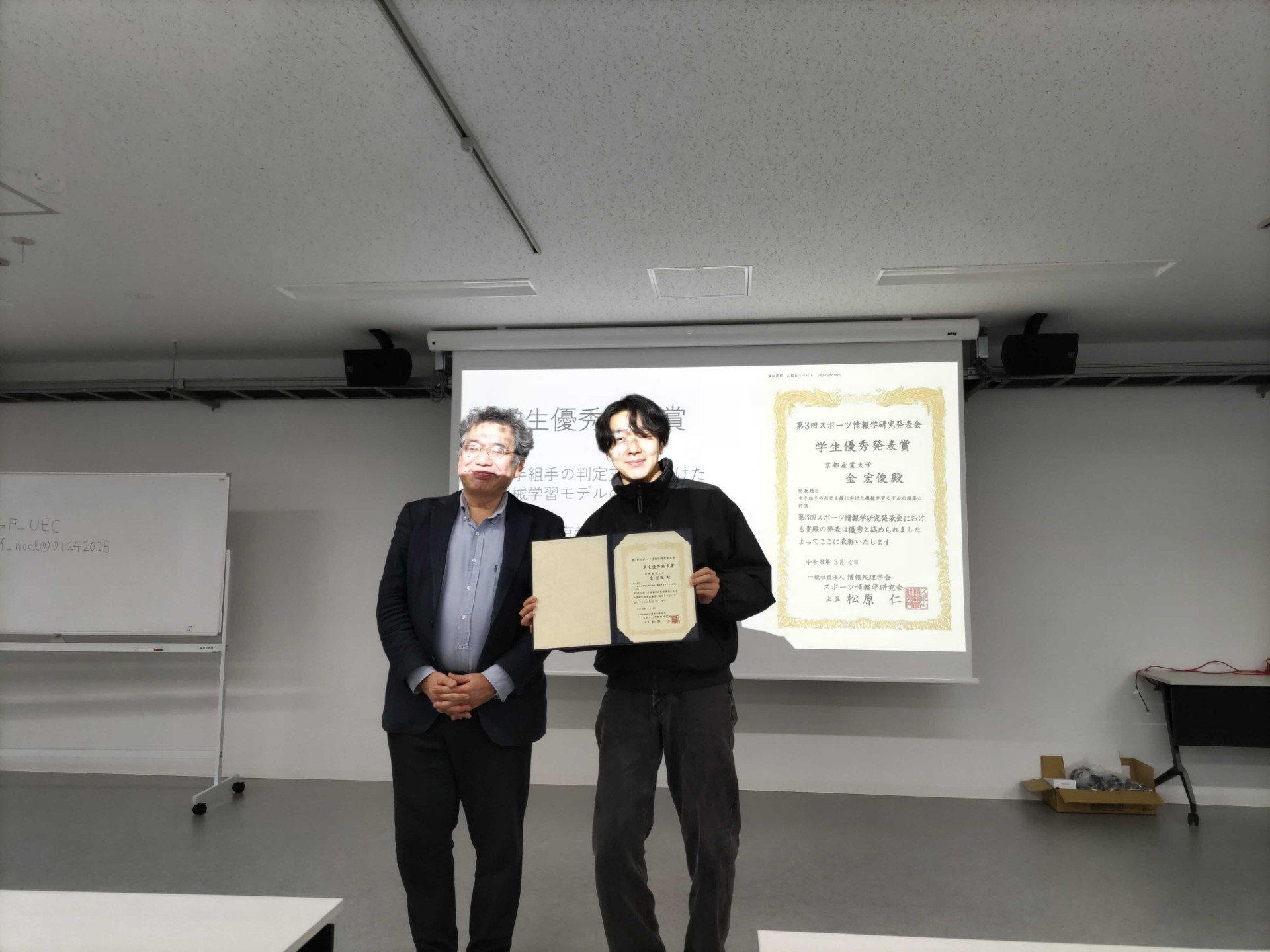 この受賞は、2025年11月の第3回スポーツ情報学研究会で金さんが発表した「空手組手の判定支援に向けた機械学習モデルの構築と評価」によるものです。