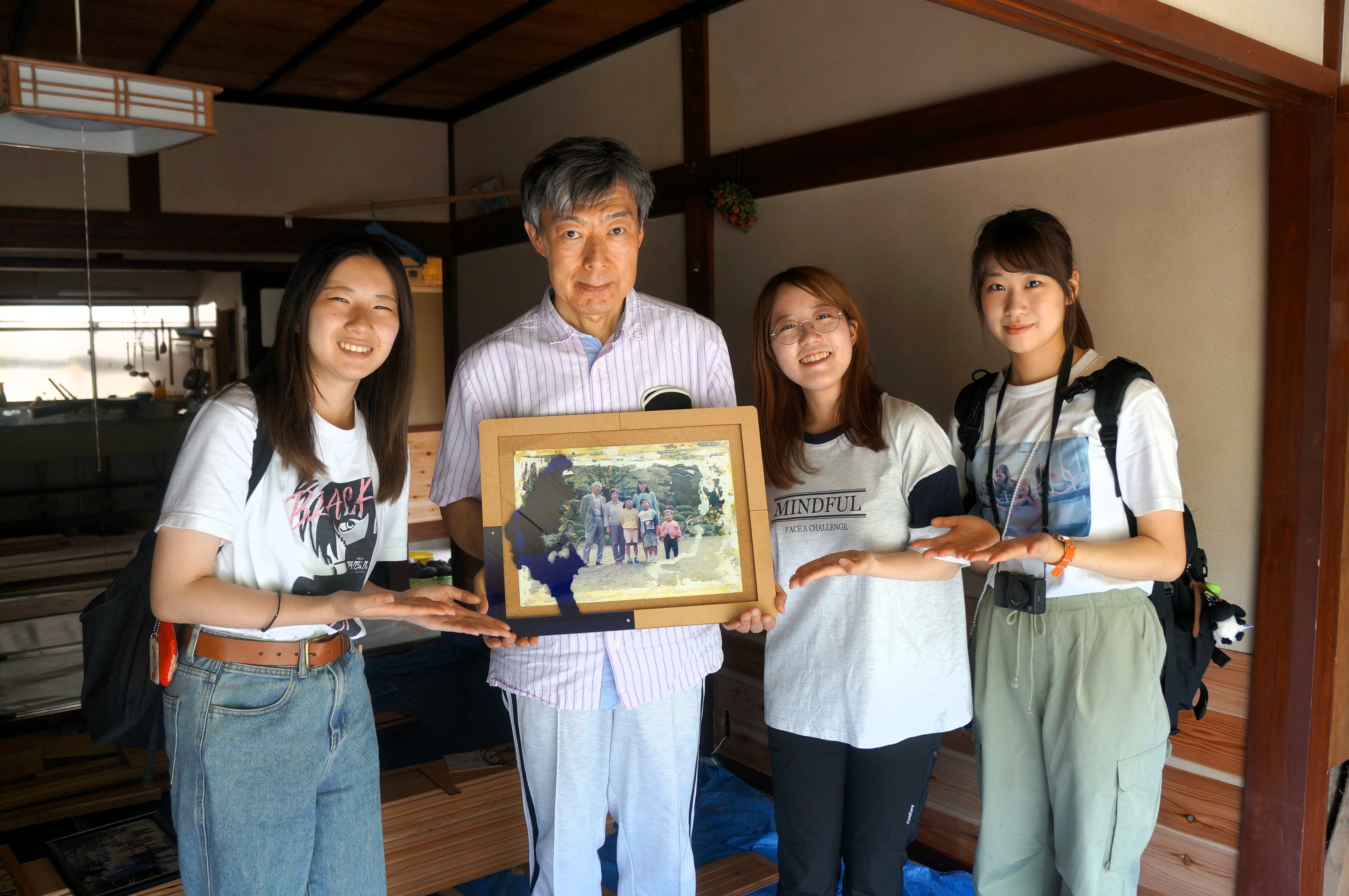そこで、写真を大切な思い出として残していただけるよう、新たに額縁を制作し、その中に収めてお返しすることとしました。額縁は能登半島をモチーフにデザインし、損傷部分が目立ちにくくなるよう工夫しました。デザイン・制作にあたっては、本学情報理工学部伊藤慎一郎研究室の協力のもと、レーザーカッターを用いて作成しました。