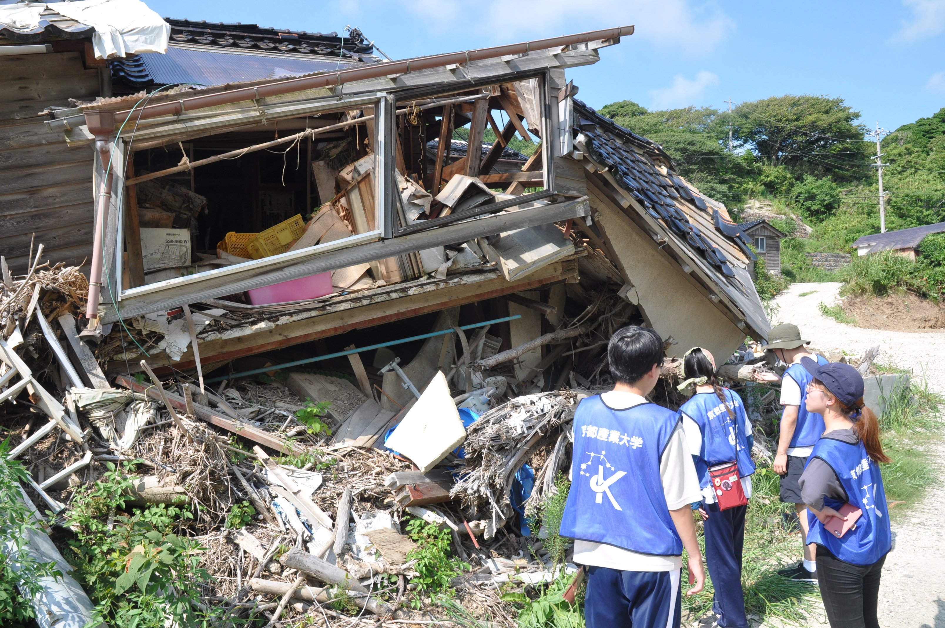 西保地区では、お茶や菓子を持参して戸別訪問を行い、生活状況や体調の聞き取りを通じて、住民の方々の困りごとの把握に努めました。炎天下での活動は厳しいものでしたが、被害の痕跡が色濃く残る地域の現状から、復興に関する新たな学びを得る機会となりました。