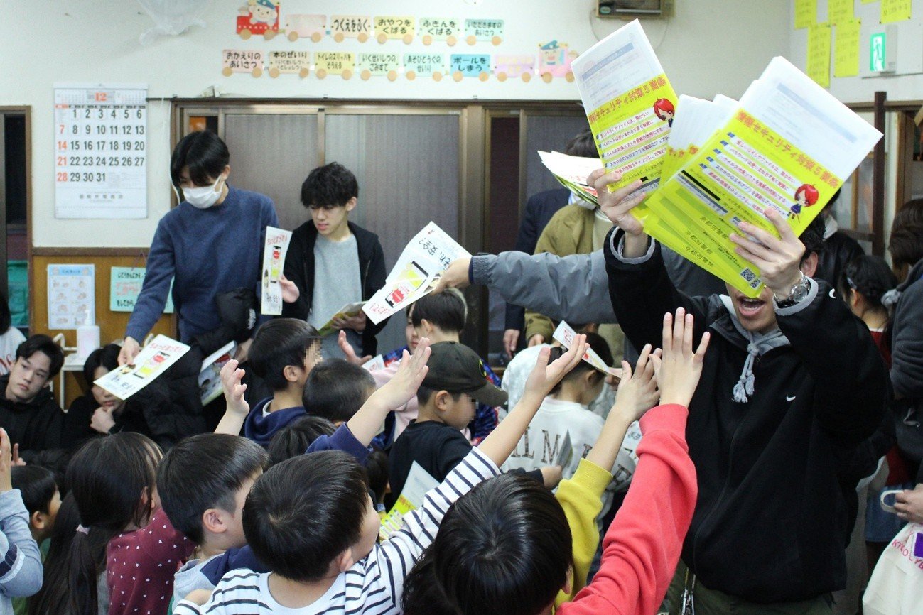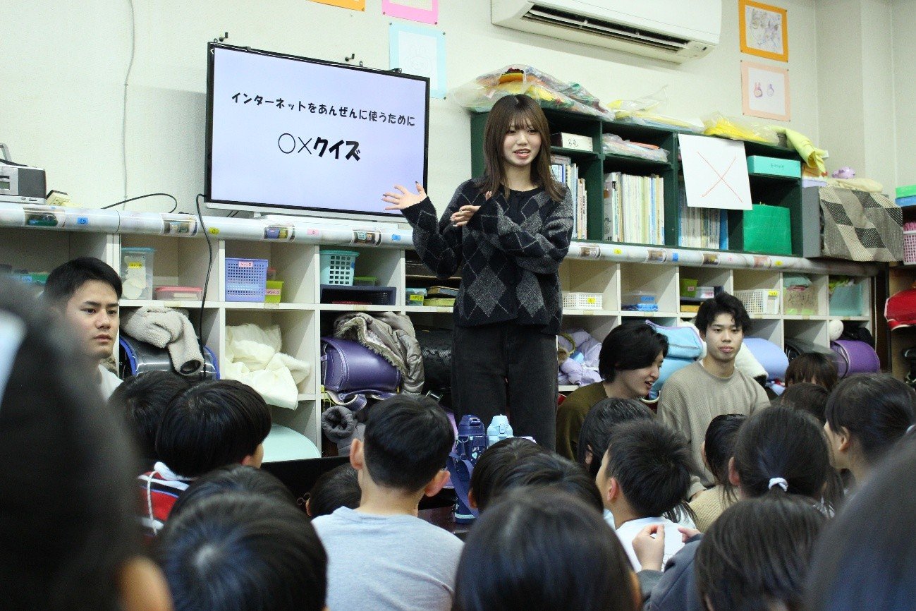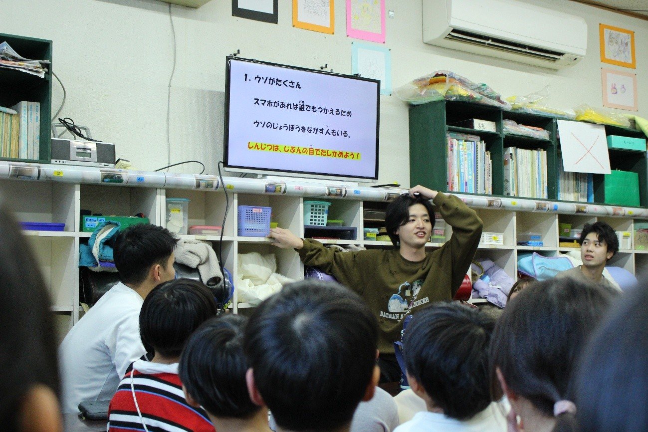 令和7年12月16日、岡部ゼミ(社会安全政策)が大学にほど近い柊野児童館において、小学校低学年の児童約50名に対し、インターネットの正しい利用のあり方や、ネット空間に潜む危険性などについての情報モラル教育を行いました。