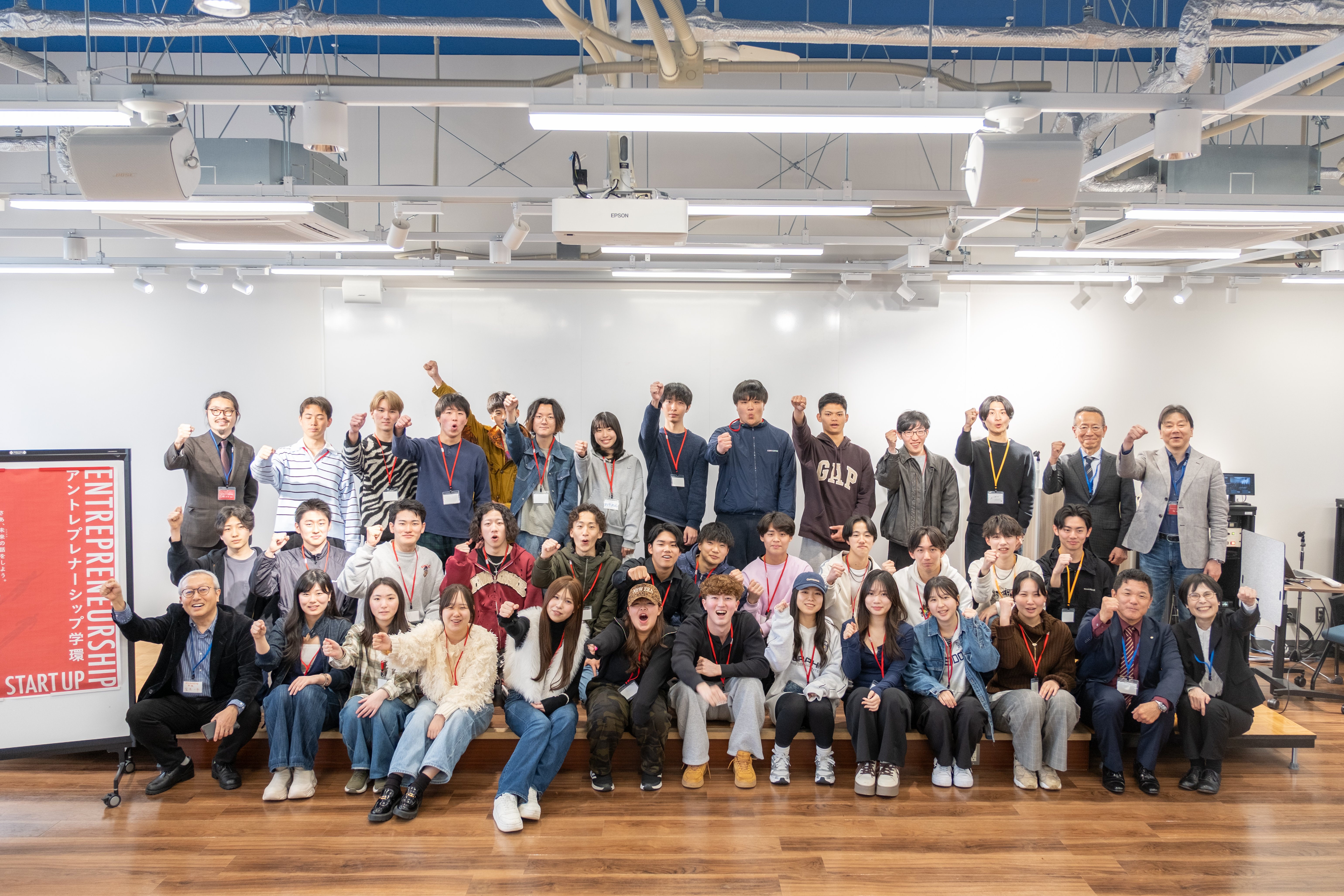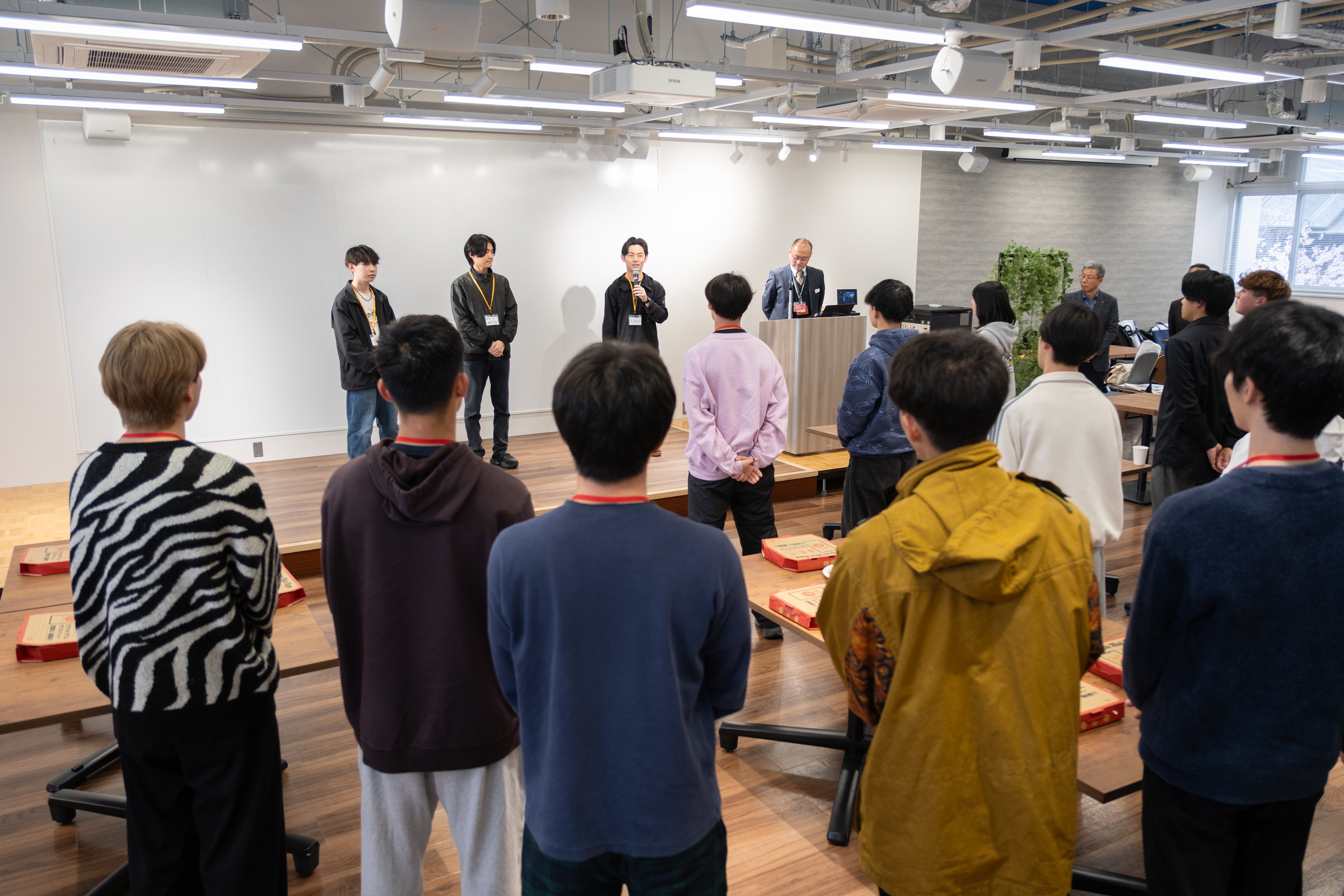 また、ビジネスプランコンテストの舞台となってきたステージに立ち、一人ひとりが自己紹介を行いました。憧れの舞台に立つその時間は、これから始まる自分自身の挑戦を、少しだけ先取りするような瞬間でもありました。最後には全員で記念のスナップショットを撮影。節目の一日が、確かなカタチとして刻まれました。