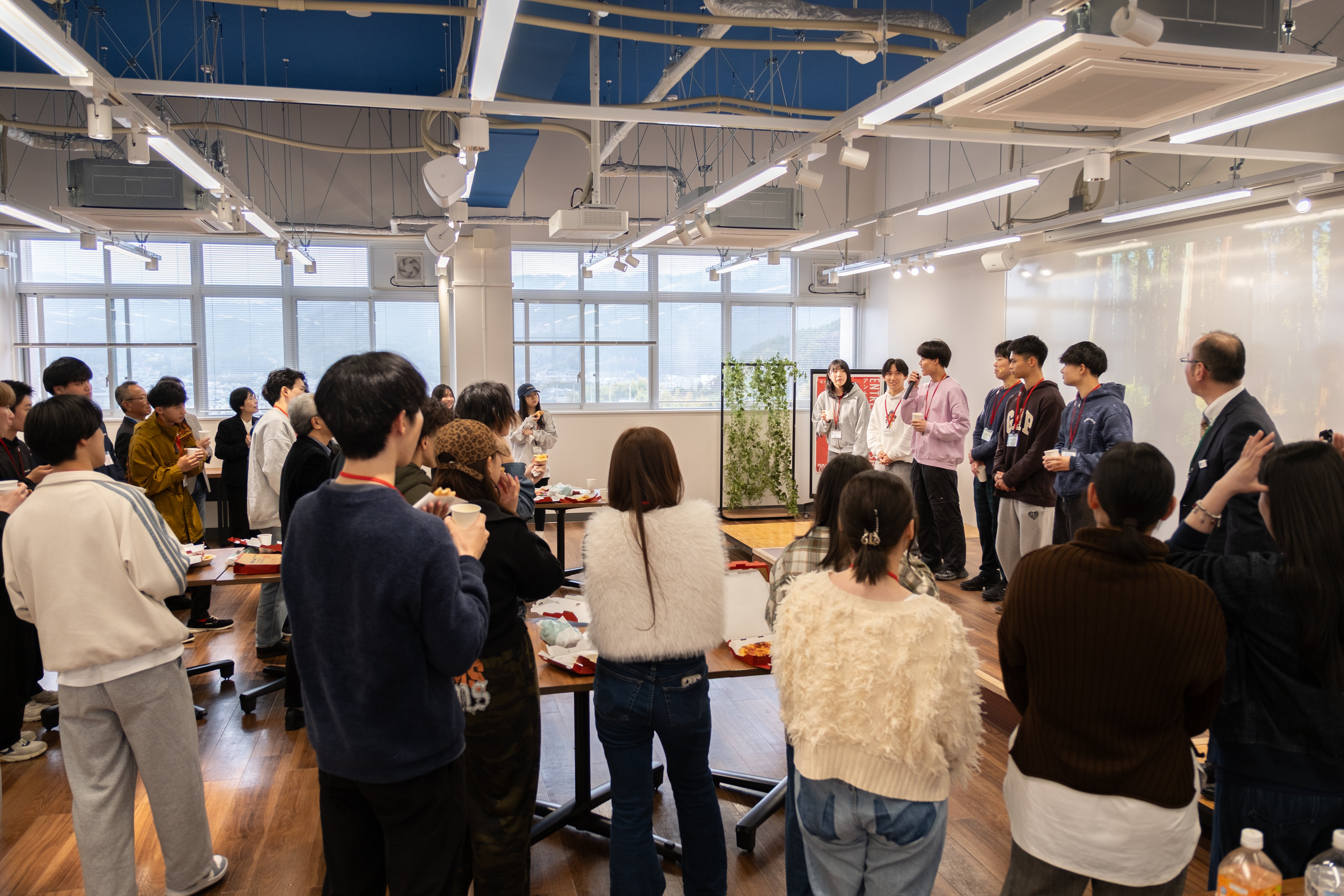 オリエンテーション後の交流会では、在間学長から第1期生へ激励の言葉が贈られました。さらに、これまで学環の立ち上げに関わってきた教員や、アントレプレナー育成プログラムで学んできた先輩学生たちも駆けつけ、新入生たちを迎えました。次第に緊張の空気がほどけ、笑顔が連鎖していきます。ここで出会った仲間や先輩、教職員とのつながりが、これからの挑戦を支える最初のネットワークになっていきます。