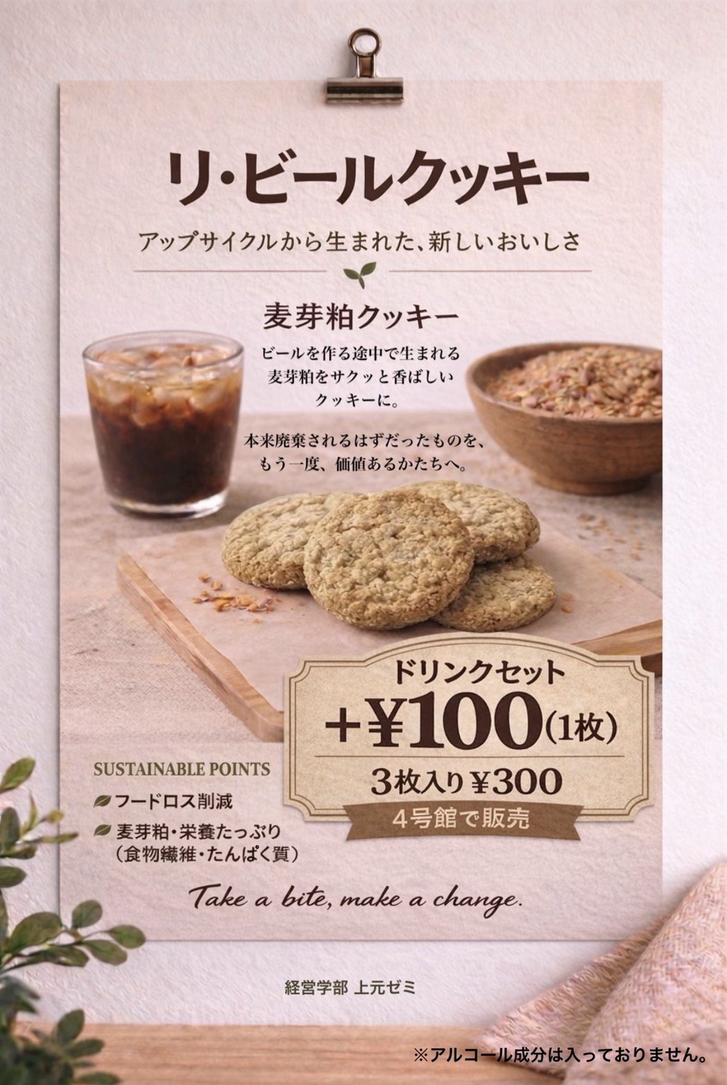 3人は、身近で日持ちがしやすいクッキーに麦芽粕を用いることを考えました。小麦粉に対する麦芽粕の割合を10%、30%、50%とした試作品を比較検討し、10%の麦芽粕を小麦粉に混ぜたクッキーを販売に向けて完成させました。完成した麦芽粕クッキーは、ビールを原材料にしていることや、廃棄されていたものを再利用したという意味で「リ・ビールクッキー」と名付けました。本学の4号館Innovationラウンジにてオープンした本学有志メンバーにより運営される 「Cafe BRE+ND」とコラボレーションし、2026年3月28日に販売を行いました。店頭では、クッキー単体のみならず、「Cafe BRE+ND」で提供されるコーヒーとセットでも販売され、80個が完売し、廃棄されるはずのものを価値化することに成功しました。