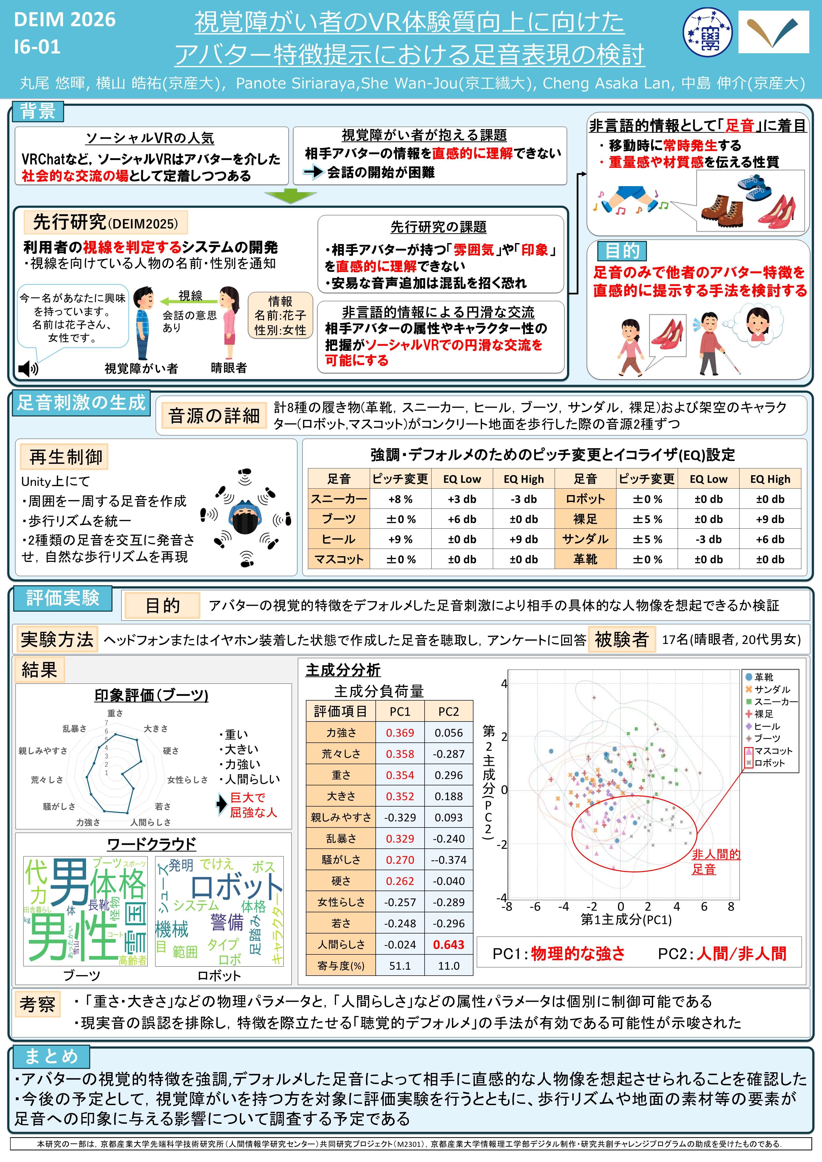 本研究で得られた足音の設計指針をベースに、実際の視覚障がい者の方々を対象とした評価実験を行い、より実用的なアクセシビリティ支援へと発展させたいと考えています。また、現在は定型的な足音の提示に留まっていますが、将来的には足音のテンポを操作することで個人の識別に有効か検証したり、ユーザーの好みや状況に合わせて、相手の足音をより親しみやすく動的に変換するシステムの構築を目指します。姿が見えないことによる威圧感や不安を音のデザインで解消し、誰もが能動的に、そして安心して楽しめるインクルーシブなメタバースの実現に貢献していきたいです。