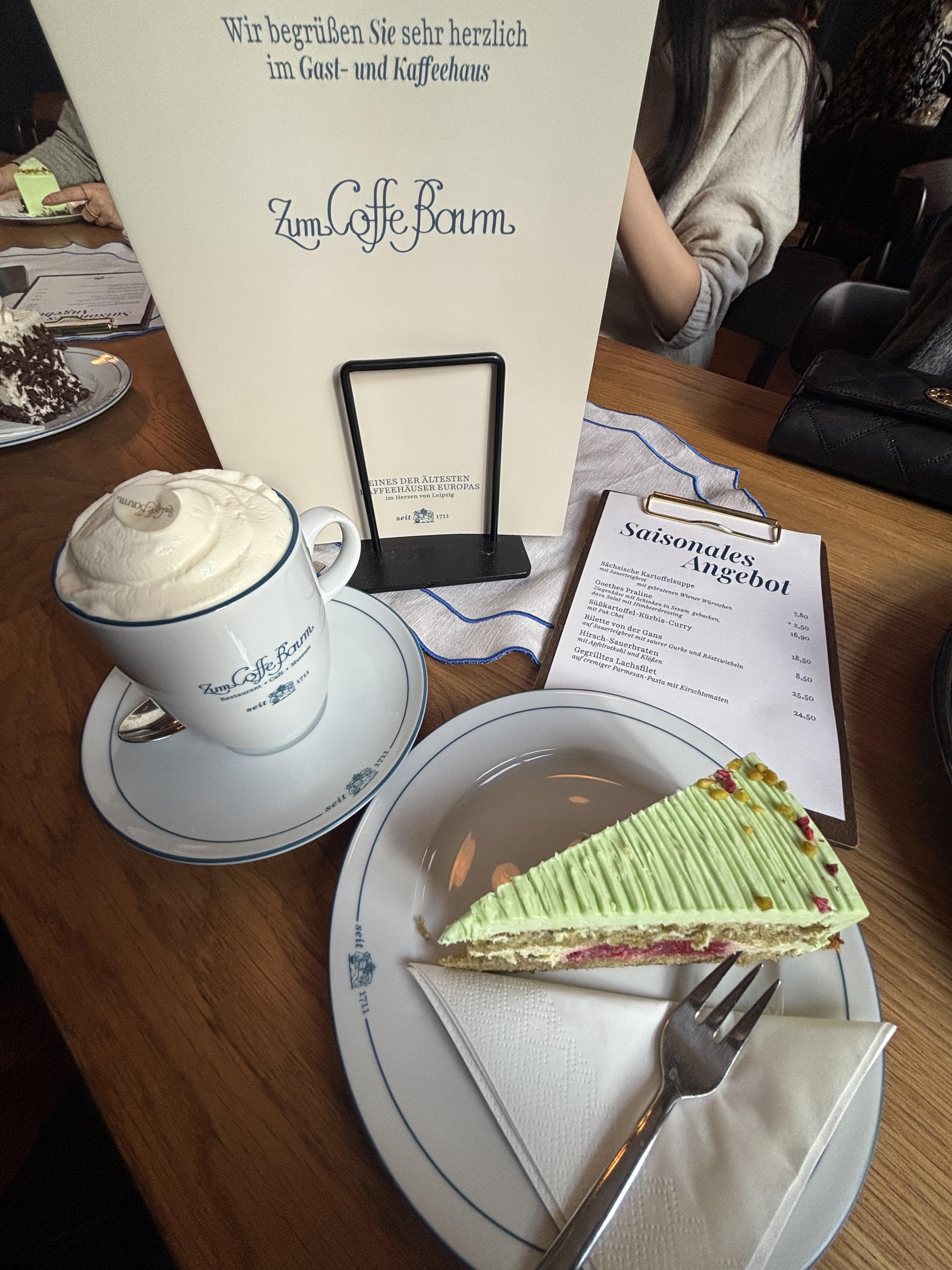 滞在最終日には、ドイツ最古のコーヒーハウスとして知られるカフェ・バウムを訪れました。1711年創業で、バッハやゲーテ、ナポレオンも訪れたとされる歴史あるカフェです。私はホットホワイトチョコレートとケーキを注文し、落ち着いた雰囲気の中でゆっくりとした時間を過ごしました。ドイツではカフェで長時間過ごす文化が根付いていると感じました。