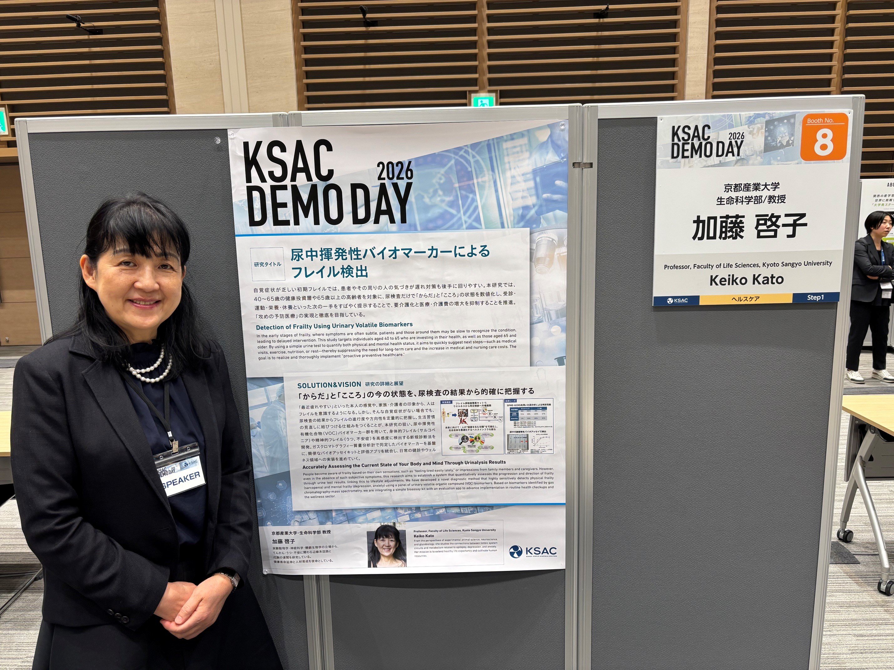 2026年4月14日、コングレコンベンションセンター(グランフロント大阪北館地下2階)にて、関西圏の大学発スタートアップの祭典「KSAC DEMODAY 2026」が開催されました。本イベントにおいて、生命科学部の加藤 啓子教授が、「第2回 KSAC-GAPファンド」の採択研究者として、ピッチセッションおよびポスター発表を行いました。