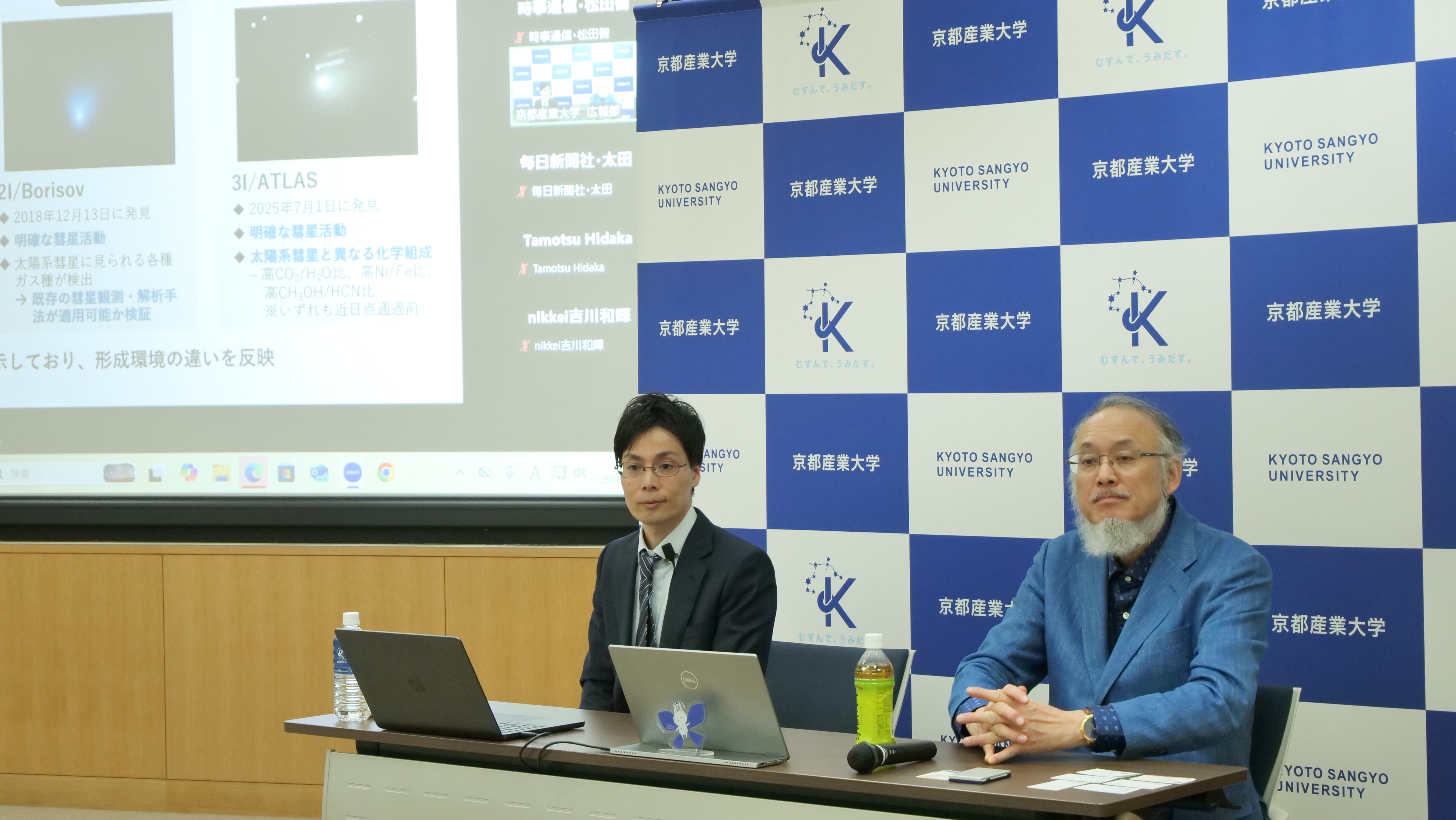 2026年4月13日に開催した記者説明会では、渡部潤一 神山宇宙科学研究所長と新中善晴 専任専門員(研究機構)が、恒星間彗星3I/ATLASの観測から、太陽接近に伴ってCO2/H2O比が変化した可能性が示されたことを紹介しました。あわせて、その結果が恒星間彗星の表層と内部で化学組成が異なる可能性を示唆する点など、本研究成果の概要とその意義について説明しました。
