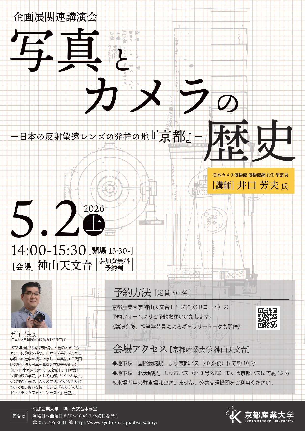 当日は、日本カメラ博物館 博物館課主任・学芸員の井口 芳夫(いのくち・よしお)氏を講師に迎え、写真とカメラの歴史を通して、日本の写真史・カメラ産業史における京都の役割についてお話しいただきます。講演会終了後には、企画展を担当した神山天文台学芸員によるギャラリートークも実施します。天文と写真、そして京都のものづくりの歴史を関連づけて学べる機会です。