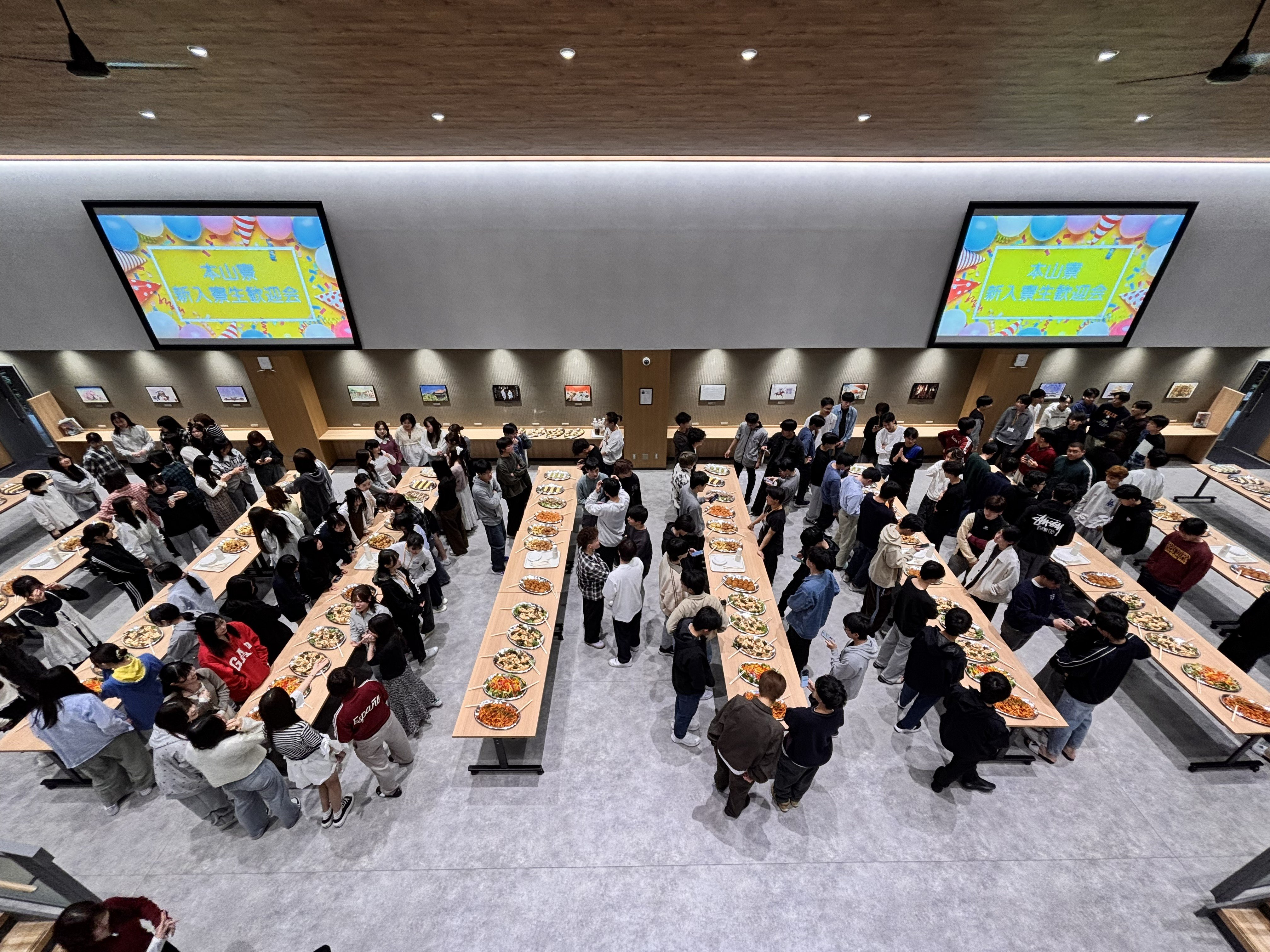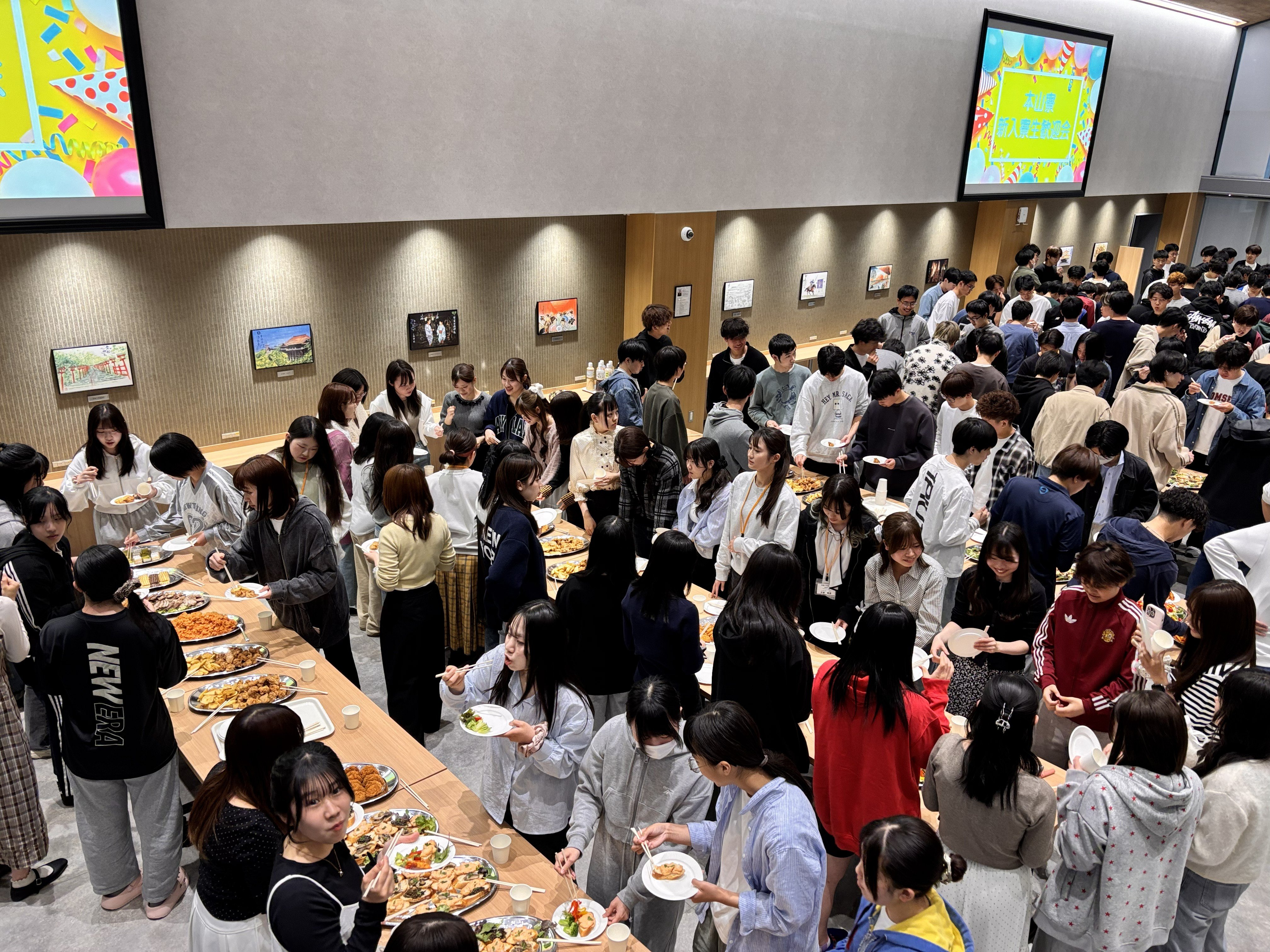 会場では新入寮生・在寮生・職員が集まり、自由に会話を楽しみながら親睦を深めました。最初は少し緊張した様子も見られましたが、時間が経つにつれて自然と会話が広がり、笑顔あふれる和やかな雰囲気へと変わっていきました。