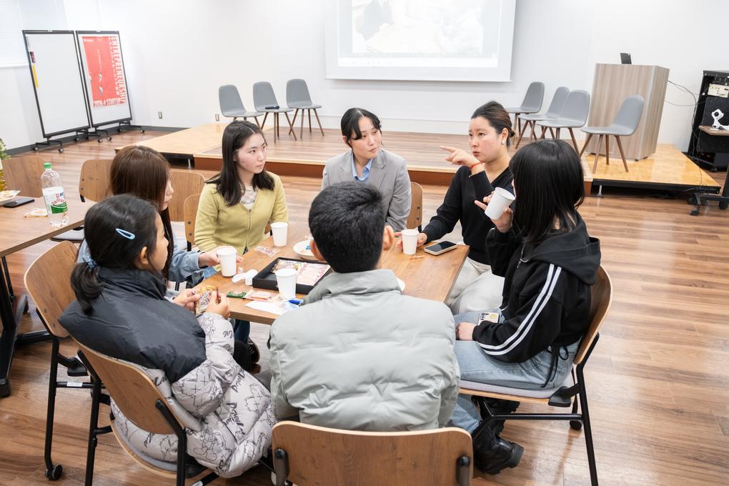 イベント後の交流の場は、日本のお菓子とジュースを楽しみながらの会話が弾みました。特に卒業生からは自然と質問が投げかけられ、学生同士と卒業生の交流が活発に進みました。