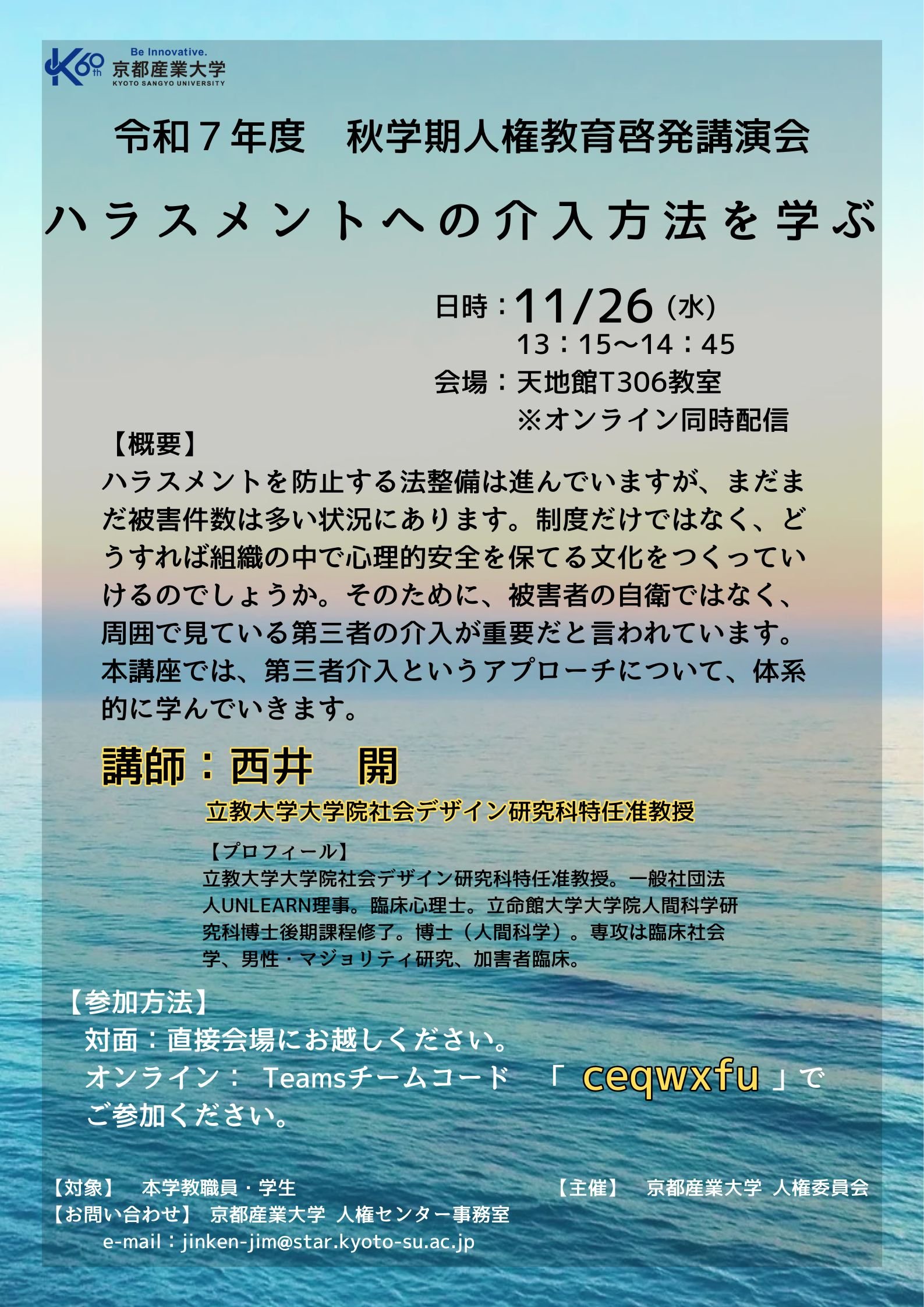 2025年度秋学期人権教育啓発講演会「ハラスメントへの介入方法を学ぶ」を開催しました