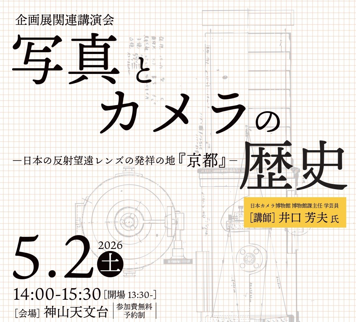 - 2026年度第1回天文学講座・企画展関連講演会「写真とカメラの歴史 日本の反射望遠レンズの発祥の地『京都』」を開催します(2026年5月2日)