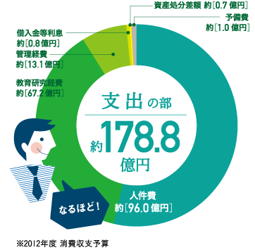 支出の約7割を皆さんの教育・研究活動費に充て、一人当たり年間約128万4千円で学生生活をサポート!目一杯活用してくださいね。