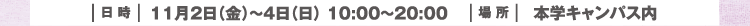 主に文化系のクラブ・サークルやゼミが日頃の活動成果を12号館と5号館で展示・発表。さらに8号館の食堂がライブハウスになるなど、屋内企画も充実しています!