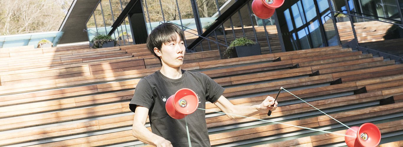 石水さん:きっかけは小学6年生のときに家族で観に行ったシルク・ドゥ・ソレイユの公演でした。ディアボロのパフォーマンスを観たときに興味を惹かれ、「自分もやってみたい!」と思ったのです。その後、親にディアボロを買ってもらい、Webで動画を観ながら独学で学んでいきました。新しい技ができるようになるのが嬉しく、毎日夢中になって練習。初めて大会に参加したのは、高校1年生のとき。関西大会で上位に入り、高校2年の春に開催された日本高校生ジャグリング大会で優勝することができました。それ以来国内外の大会に参加し続けており、昨年は台湾で行われたアジアインターナショナルディアボロカップで2位に入っています。