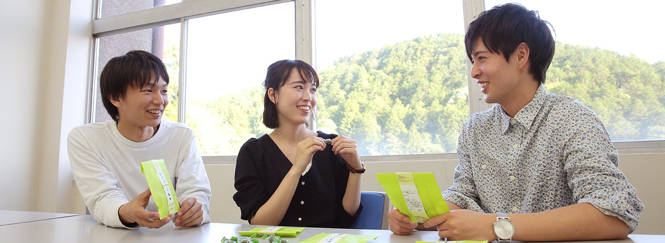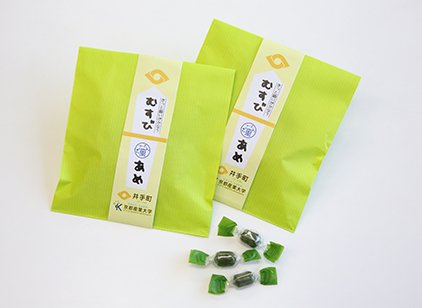 経済学部大西ゼミでは、京都府南部にある井手町の地域おこしを目的に、継続的に「井手応援隊」として活動を行っている。今回形になったのは、井手町産の高級宇治抹茶と本学で収穫したハチミツを組み合わせた抹茶味の飴、「むすびあめ」。町の新たな特産品を目指して商品開発に取り組んだ。