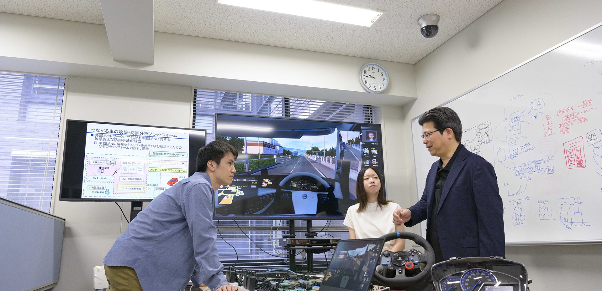 スマートフォンや家電製品、自動車など、現代の暮らしに欠かせない便利な機器の数々には、それらを制御する「組込みシステム」が採用されている。今やモノづくりの基盤となった組込みシステムだが、インターネットに常時接続する必要があるため危険にさらされやすい一面も。髙田が所属する井上研究室では、こういったIoTデバイスにおける脆弱性分析や攻撃・防御手法などについて研究を行っている。