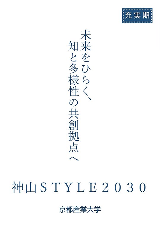 京都産業大学は、創立50周年を迎えた2015(平成27)年に、15年後となる2030(令和12)年においても日本を代表する私立大学の一角を担う存在であり続けるため、社会からの要請を踏まえて積極的に取り組むべき施策を、中期事業計画「神山STYLE2030」としてまとめました。あわせて、産業を「むすびわざ」と読みとく本学は、建学の精神を原点とする大学像「むすんで、うみだす。」、育成する学生像「むすぶ人」を掲げました。