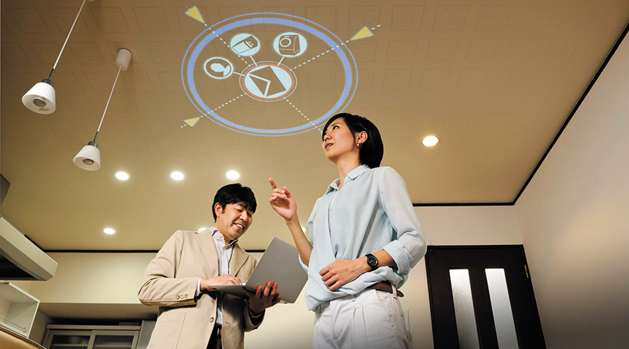 平井准教授:このシステムを開発するには2つの技術が必要だと考えています。一つは、人の行動や行為を測る技術。これは本学の実験住宅でのスマートホーム化に対する重要な技術的取り組みの1つです。そしてもう一つは人に対して情報を認知させるための技術。これは目に見える視覚的な技術であったり、音で知らせる聴覚的な技術であったりさまざまです。これも住宅のスマートホーム化という観点で重要です。そんな中でも、「視覚的に知らせる」ということに関しては、従来のテレビやスマートフォンといった画面ではなく、周囲の環境をディスプレイとして使えるだろうと想定していました。
