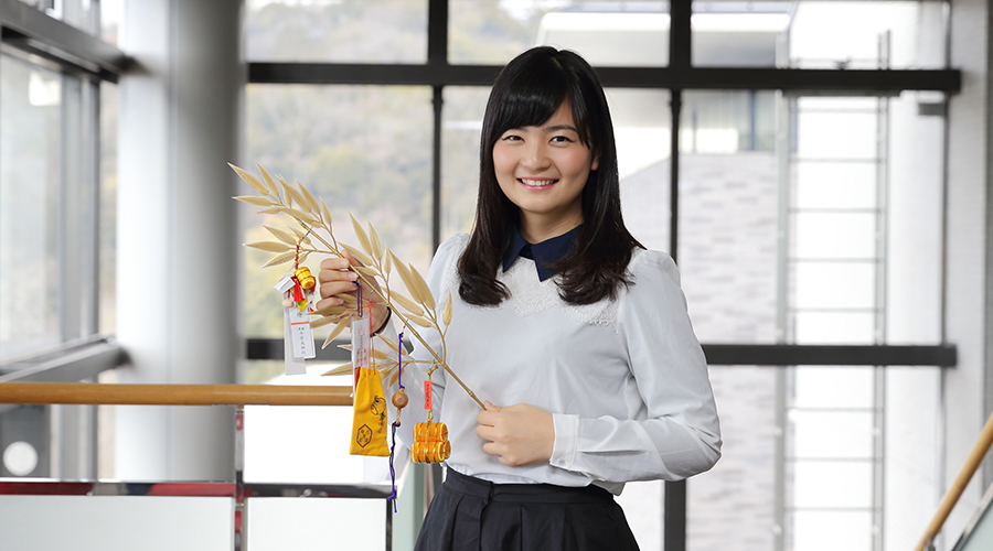 「今宮戎神社の福娘になりたい!」。強い憧れを抱いた6年前のあの日のことを今でもはっきり覚えています。父と初めて「十日戎」に行った時、美しくてキラキラしている福娘に出会い、すっかり夢中になりました。「福娘になりたい」と私が言うと、父は「福々しい顔をしているから、向いているかもね」と一言。今思えば、その言葉が憧れを目標に変えてくれたのかもしれません。福娘の募集に初めて応募したのは2年次生の時でした。残念ながらその時は落選してしまったのですが、諦めきれずに3年次生の時に再び応募。書類審査、面接、選出審査と進み、迎えた最終審査では審査員や観客の方々の前で「参詣者の皆さんを笑顔にします!」と言い切りました。周りはかわいい子ばかりで、正直な所自信はありませんでしたが、合格発表でまさか自分が選ばれるなんて…。あまりに驚いて一瞬喜ぶことを忘れていましたが、会場に来ていた両親がハイタッチする姿を見た時に、嬉しさがこみ上げてきました。