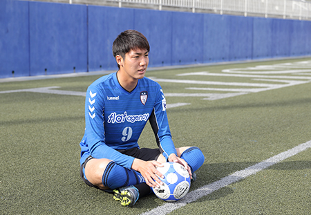 昨年1年間の成績が評価され、2017年3月に「JFA・Jリーグ特別指定選手」の認定を受けました。それ以来、私は京都産業大学のサッカー部に所属しながら、部活が休みの日などに受け入れ先であるガンバ大阪のJ3の練習に参加させてもらっています。今回評価されたのは193cmの身長を活かした攻撃力だと考えていますが、プロ選手と一緒に練習をしていると、試合中の判断の早さや一つひとつのプレーのキレにまだまだ差があると感じます。この差を埋めるには、日々の練習の質をできるだけ高めなければ…。そう考え、今はウォームアップから全力で取り組んでしっかり体を温め、シュート練習やゲーム練習などで試合を想定した正確なプレーを繰り返し行うことで、試合で役立つプレーを体に覚え込ませています。一つひとつのプレーを丁寧に行い、毎日力を出し切って着実に成長していき、将来は日本代表のフォワードを任される選手になりたいと考えています。