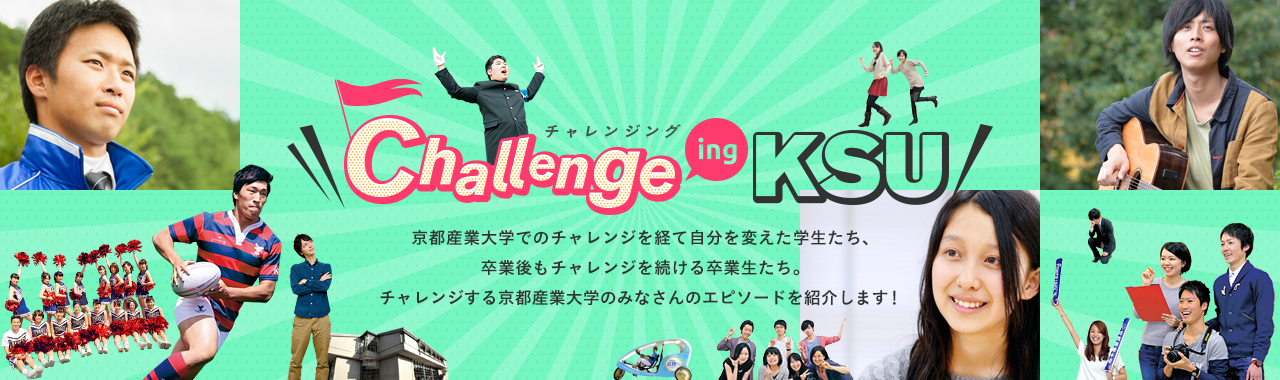 京都産業大学でのチャレンジを経て自分を変えた学生たち、卒業後もチャレンジを続ける卒業生たち。チャレンジする京都産業大学のみなさんのエピソードを紹介します! 全て 留学・グローバル 就職・キャリア スポーツ 文化活動 地域 ゼミ・研究 課外活動 サギタリウスチャレンジ 卒業生 地域 近江日野しゃくなげ大使に就任 経営学部 2年次 小倉 風花さん ゼミ・研究 第6回観光学術学会 学生ポスターセッション 優秀賞受賞 経営学部 3年次 茶園 桜さん 経営学部 3年次 淺田 康平さん スポーツ 聴覚障害者の国際大会「デフリンピック」に出場 経済学部 1年次 笹島 航太さん 地域 京都市北区役所の依頼を受け、北区安心安全マップを作成! 法学部 3年次 梨畑 律己さん 文化学部 3年次生 村上 京さん 文化学部 3年次生 飯塚 裕紀さん 課外活動 全国大学生お笑い選手権(D-1グランプリ)2017 漫才部門 準優勝 法学部 3年次 中村 翔太さん 文化学部 3年次 櫻井 一世さん スポーツ JFA・Jリーグ特別指定選手の承認を獲得! 経済学部 3年次 和田 健太郎さん 地域 京都 嵐山・東山花灯路の散策マップを翻訳! 外国語学部 3年次生 木下 富夢さん 外国語学部 3年次生 上垣内 瑛子さん 文化学部学部 2年次生 中川 琴絵さん ゼミ・研究 実験動物一級技術者学生の部で3位受賞! 総合生命科学部 3年次 内藤 加奈絵さん スポーツ 富士山女子駅伝の第5区で区間賞を獲得! 経済学部 2年次 棚池 穂乃香さん ゼミ・研究 「情報技術」と「安全運転」をむすぶ。 コンピュータ理工学部 秋山 豊和准教授 スポーツ ローラースケート日本代表として、世界に挑む! コンピュータ理工学部 2年次生 是津 延泰さん ゼミ・研究 釜山国際広告祭の学生部門でクリスタル賞を受賞! 経営学部 3年次生 松岡 えりかさん 経営学部 3年次生 武部 夏帆さん 経営学部 3年次生 髙取 沙季さん スポーツ 第21回全国学生カート選手権で優勝! 法学部 3年次生 奥村 一修さん 課外活動 地域の周年イベントで、初挑戦した作品を展示! 法学部 3年次生 藤原 大樹さん 経営学部 3年次生 花高 大輝さん 就職・キャリア マレーシアで4ヵ月間の有給インターンシップを経験! 経済学部 3年次生 髙田 浩輝さん 経済学部 3年次生 島田 大さん 課外活動 全身全霊のエールを送り、「チーム産大」を応援! 経営学部 3年次生 内田 隼人さん 文化学部 2年次生 藤花 隼人さん 留学・グローバル 学生目線でつくる国際交流。 留学生とのコラボレーションが グローバルキャンパスをうみだす。 外国語学部 国際関係学科 4年次生 オリバレス ラファエラ ヨシイさん スポーツ 共に日の丸を背負い、世界と戦う。空手道日本代表 法学部 2年次生 中島 啓太さん 経営学部 1年次生 中島 智也さん スポーツ 自転車競技のプロチームで世界の強豪に挑む 経営学部 4年次生 中井 路雅さん 経営学部 2年次生 中井 唯晶さん スポーツ 互いを思う気持ちを、個々の強さに。武術太極拳で世界を魅了する 外国語学部 3年次生 大津 こころさん 外国語学部 1年次生 大津 夕陽さん 外国語学部 1年次生 大津 朝陽さん 地域 世界遺産・地域・学生。 社会連携から生まれる、 新しい価値 経済学部 3年次 平松 和之さん 外国語学部 4年次 西澤 沙織さん 地域 京都産業大学50年の 歴史を学び、未来へつなぐ学祖の意志 理学部 3年次 東田 喜輝さん 法学部 3年次 綾部 歌音さん 法学部 3年次 井原 彩子さん 留学・グローバル アメリカ人が持つ日本人のイメージを変えたい! 俳優 米本 学仁さん 地域 十日戎で参詣者を笑顔にする、第64代福娘に! 経済学部 3年次 森下 葵さん スポーツ KARATE1プレミアリーグ沖縄大会で優勝! 法学部 3年次 大西 英輝さん スポーツ 体育会所属クラブに昇格!次に目指すのは、世界一 経済学部 2年次 前田 恭兵さん 外国語学部 2年次 竹内 さゆりさん ゼミ・研究 湯原温泉のビジネスプランコンテストで優勝 経営学部 2年次 大槻 翼さん 経営学部 2年次 真銅 妙歌さん 経営学部 2年次 中村 公彦さん 課外活動 京都学生演劇祭で審査員特別賞を受賞! 経済学部 2年次 中村 祥真さん 経済学部 3年次 新保 七海さん 課外活動 学生落語の全国大会 「てんしき杯」で2度優勝! 経済学部 4年次 池上 拓真さん ゼミ・研究 実践的な学びを 地域の力に。 学生視点で発信する、まちの魅力 経済学部 3年次 小林 史弥さん 経済学部 3年次 齊藤 祐佳里さん 経済学部 大西 辰彦教授 課外活動 「サギタリウス・チャレンジ」で、夢へつづく一歩を踏み出す 外国語学部 2年次 渋谷 薫さん 経営学部 ドレスラー・カタリナさん 経済学部 2年次 久保 力也さん 地域 地元代表として魅力を伝える びわ湖大津観光大使に就任! 文化学部 3年次 濱口 彩音さん 課外活動 宇宙研究・天文学を より身近に。 学生の学びと地域をつなぐ天文台 理学部 3年次 森木 銀河さん 総合生命科学部 3年次 神原 育穂さん 理学部 河北 秀世教授(神山天文台長) ゼミ・研究 大学から社会全体へと広げる、 女性が輝くための環境づくり 生命科学研究科 1年次 松島 章子さん 工学研究科 博士後期課程 3年次 吉田 亜