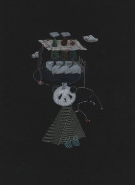 紙を折り畳んで他のひとが何を描いたのかをわからないようにしながら、頭、胸、腰、足を順番に描いていく手法である。常識の枠を越えた、不可思議なイメージを作り出せる。シュルレアリストたちが1920年代から集団で行っていた遊びである。普通は複数で行うところを、有持はこれをひとりで行う。