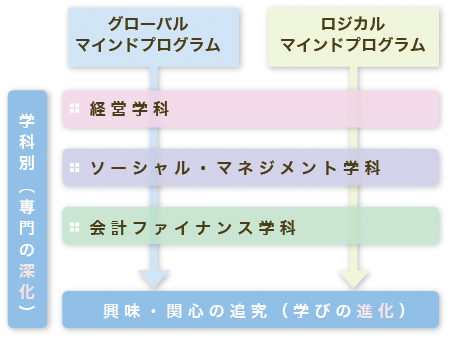 学生の皆さんの興味・関心を尊重しつつ、今日的で、かつ経営の現場において求められる力を向上させることを念頭に置いて提供するのが、グローバルマインドプログラムとロジカルマインドプログラムです。