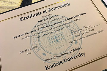 また、言語能力や学習面以外でも多くの経験をさせていただくことができ、非常に充実し、自分の人生に大きな影響を与えてくれた一年間になりました。この一年間での一番大きな経験は留学先の大学の国際センターでの言語教育インターンシップです。韓国では日本への進学や就職がブームとなっており、それに伴って日本語を習得したいと考える学生が多くいます。そこで私はそのような学生に対して日本語を教えるボランティア活動を行いました。その中で自分の母語への知識の無さや日本語の文法の複雑さ、自分の方言の強さなどに気づき、自分が嫌になった時もありましたが、熱心に日本語を学んでいる韓国人学生を見て「自分も頑張らねば」という感情が湧いてきて三ヶ月間のインターンシップを無事修了することができました。授業内では語学だけでなく日本の文化などにも触れ、授業終わりに学生と一緒に日本人が営んでいる日本食店に行き、実際に日本の食文化に触れてもらうという活動もできました。