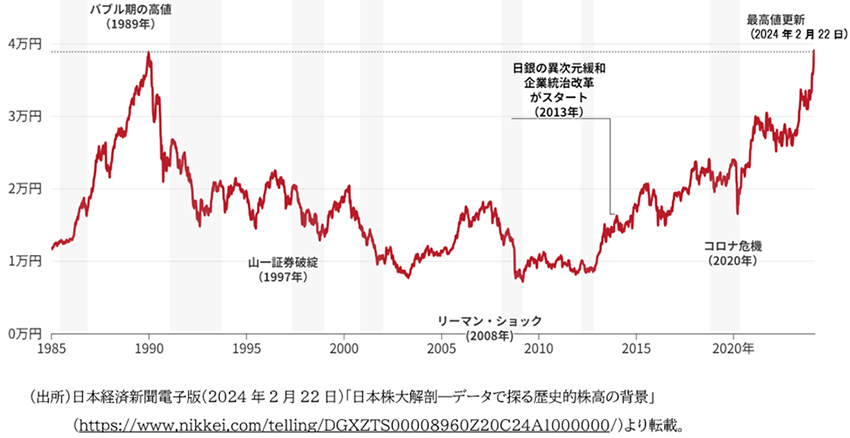 (注1)日本経済新聞電子版(2024年2月25日)「株価最高値、今回はバブルにあらず 89年と違う企業と個人」による。