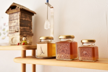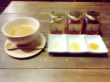 カフェでは10日間、数量限定で温かいチャイという飲み物にハチミツを入れて飲む、というメニュー(写真)を提供しました。使用したハチミツは京都産の「とち」、外国産の「レザーウッド」「カボチャ」の3種類です。