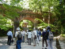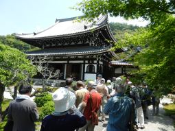 5月21日に行ったフィールドワークでは、「南禅寺界隈をゆったり、はんなり~南禅寺・流響院・光雲寺~」と題し、南禅寺を中心とした東山の寺院や庭園を見学しました。南禅寺では、三門・大方丈庭園や水路閣を見学し、南禅寺の歴史、琵琶湖疎水と東山の関係について学びました。また、通常非公開の流響院では、東山と一体となり、角度によって見え方の変わる庭園の魅力を体感しました。また後水尾天皇の中宮、東福門院和子ゆかりの光雲寺を拝観し、本尊の釈迦如来像、念持仏や寺に伝わる寺宝などを見学しました。