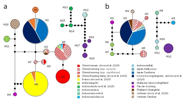 2012年に国内で初めて帰化が確認され、2015年1月に特定外来種に指定されたツマアカスズメバチの侵入経路や帰化状況の解明に関する研究を行いました。ツマアカスズメバチは、近年韓国や欧州に侵入し、農業や刺傷による被害、また在来生物を捕食するため生物多様性への影響も懸念されています。対馬市および北九州市で捕獲された個体を用いて、ミトコンドリアDNAの全長配列を決定し、そこからDNAバーコーディング法を用いて遺伝子解析したところ、中国東部に分布する亜種V. v. nigrithoraxの持つものと一致していることや、ハプロタイプネットワーク解析により、日本には船が運搬媒体となり韓国経由で侵入した可能性が高いことを明らかにしました。