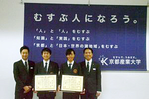 スキー部の笠原 陸さん(経営・1年次)、今井 一紘さん(法・1年次)が、クラブの合宿中に新潟県妙高山で山岳遭難者を発見し、自らの危険を顧みず救助活動に従事した行動が称えられ、妙高警察署の瀧澤 一郎署長から感謝状が贈られ、表彰されました。