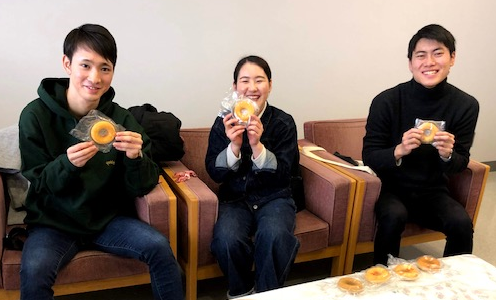 京都産業大学の学生団体「みらい発信局おむすび~静原応援隊~」と経営学部中野幹久ゼミ生が共同で、静原地域(京都市左京区)の静原神社御奉納米『しめ縄もち米』を原材料にした「しめなわドーナツ」を開発しました。静原応援隊の前隊長で、中野ゼミ4年次生の松本瑞季(写真中央)が、商品開発のストーリーをご紹介します。