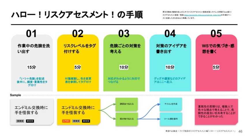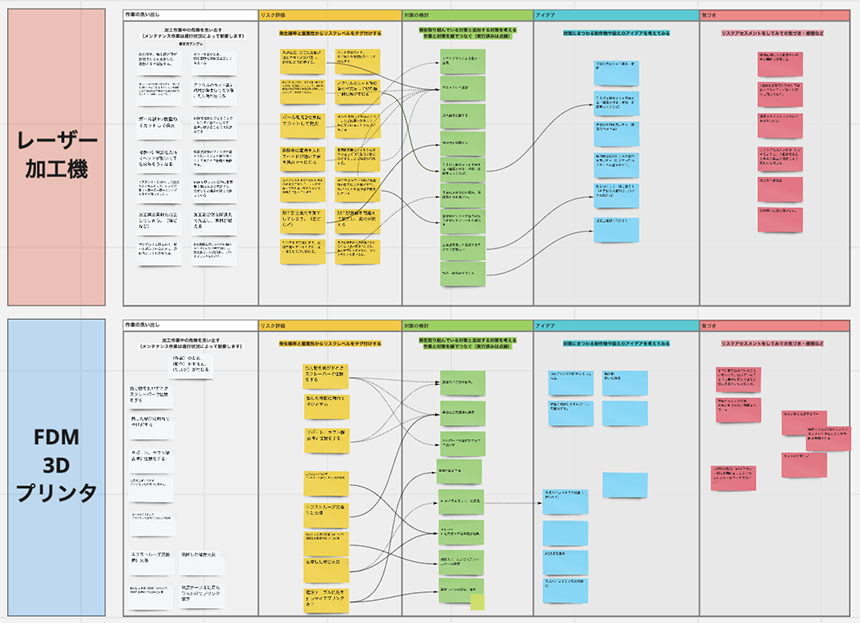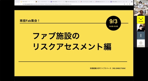 教育機関のファブスペース施設運営者を対象としたリスクアセスメントに関する勉強会を開催しました。当日は、京都産業大学ファブスペースで実施したリスクアセスメントや対策事例のプレゼンテーションをしたのち、職場のあんぜんサイトで公開されているリスクアセスメント実施支援システム汎用版の手順をベースに改変した機械に関するリスクアセスメントを、グループワーク形式でオンラインホワイトボードMiroを使用し行いました。
