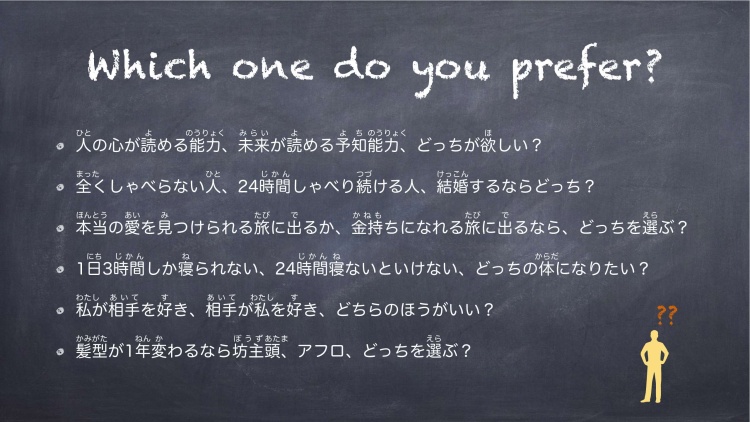 2021年度春学期に引き続き、1月30日(日)にZoomを利用して今学期メンバーでの全体イベントを行いました。イベントの中では、「人の心が読める能力、未来が見える能力、どっちが欲しい?」など「究極の二択」をいくつか準備し、選択した理由ついてディスカッションをしたり、漢字で構成した文字が何を表しているかを考える「当て字クイズ」を行ったりしました。