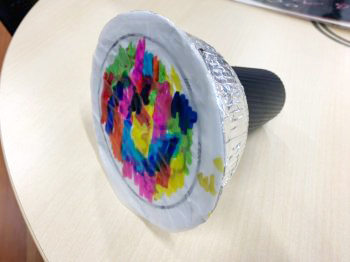 1月16日、綾部市天文館パオにおいて、地域の子どもたちを対象にしたイベント「自分だけの星空スコープを作ろう」を実施しました。「星空スコープ(写真参照)」は多摩美術大学の森脇裕之先生が監修した、プラスチック容器とトレーシングペーパー、アルミホイル等で作る「ミニプラネタリウム」。そこに各々が創作した星座を描いてもらい、それに光を当てて覗くと描いた星座が浮かび上がるというものです。それを参加者の子どもたちに作ってもらいながら、星や天文館パオに親しむ機会を作ろうというものです。