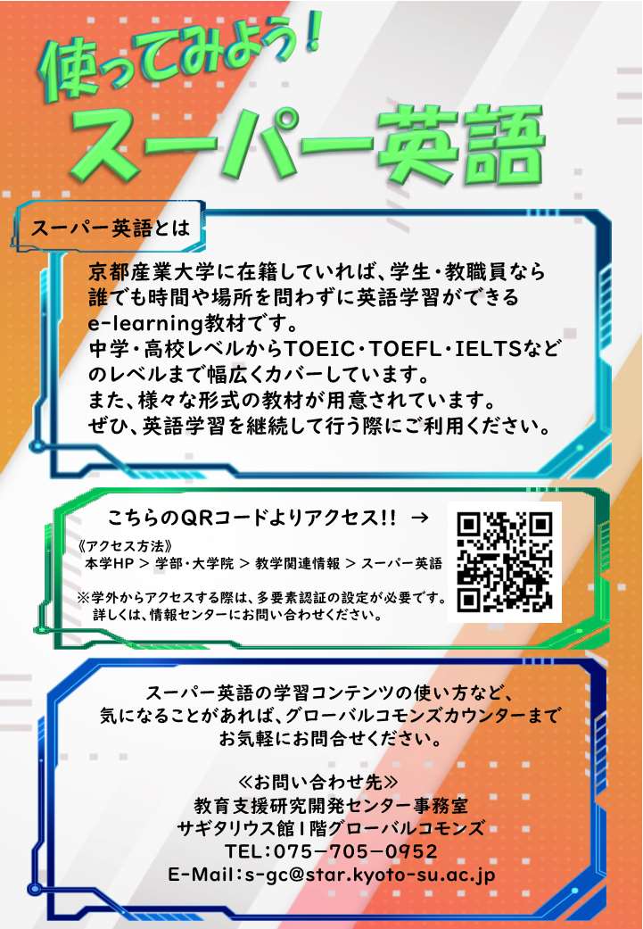 京都産業大学では、英語学習の教材としてe-learningの英語学習教材「スーパー英語」を導入しています。「スーパー英語」は、本学に在籍している学生、在職している教職員の方であれば、誰でも無料でアクセスでき、英語の力を継続利用によって、向上させることができます。