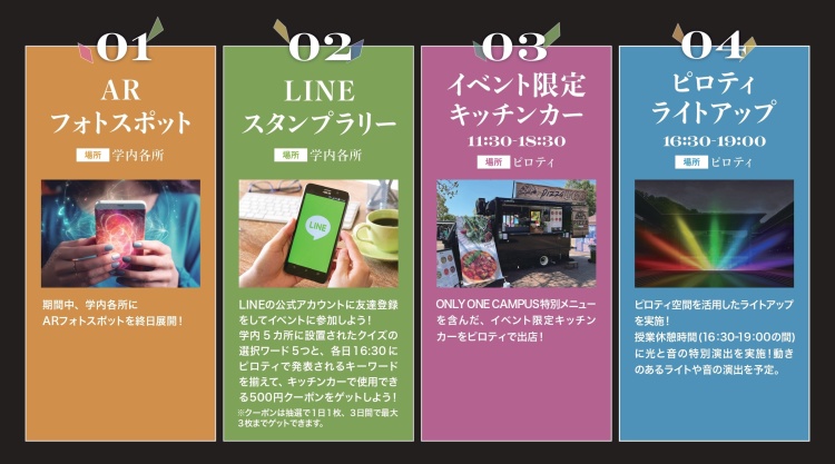 その他にも、ソフトバンク株式会社およびLINEヤフー株式会社との包括連携協定による「LINEスタンプラリー企画」や、学生がデザインを考案したARフォトスポットの設置、6台のキッチンカーの設置を行い、多くの学生がピロティエリアに集まり、楽しい時間を過ごしていました。