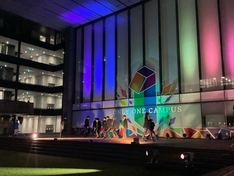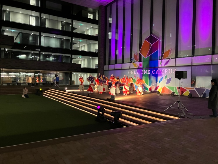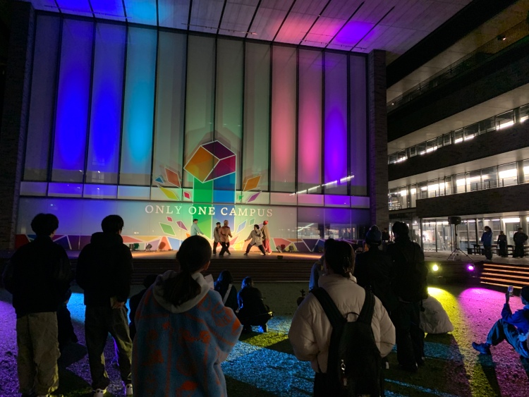 イベントでは、ピロティエリアのライトアップが行われ、課外活動団体によるステージパフォーマンスも行われました。