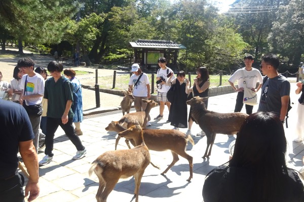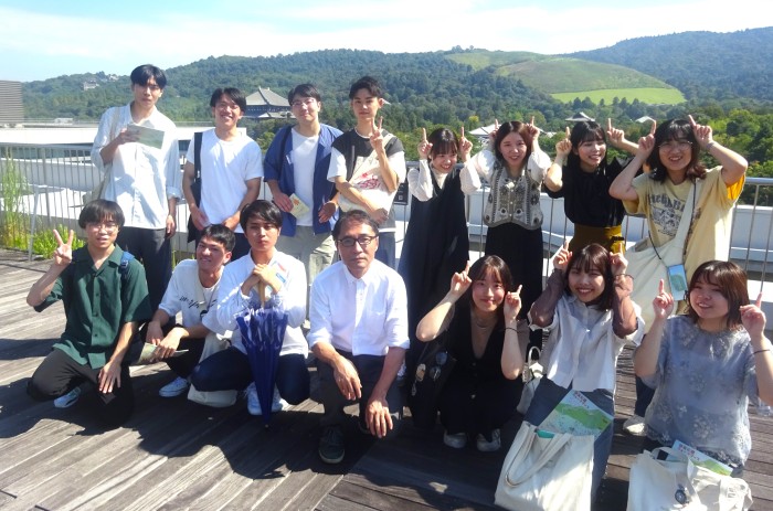 文化学部専門教育科目「観光文化演習ⅠB(担当:中野 宏幸教授)」では、9月30日、奈良で歴史文化と観光事象を学ぶフィールドワークを行いました。中野ゼミは、人類学的な視点に立って、交流・観光とそれを取り巻く現象の観察を通じ、地域の文化的価値やその魅力発信のあり方を俯瞰的にとらえていきます。