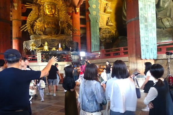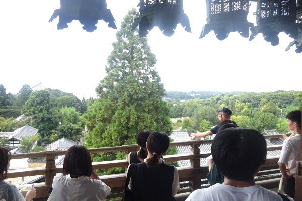 当日は、奈良まほろばソムリエの沖田 拓司氏のご案内の下、多くの外国人観光客で賑わう奈良公園エリアを中心に、フィールドワークを行いました。まず訪れたのは、752年に大仏開眼供養が行われた大仏殿です。743年の聖武天皇の詔を受けた盧舎那大仏(るしゃなだいぶつ)造立の経緯、仏像の特徴や役割、創建以降の戦乱での伽藍の焼失や再興などの歴史を学びました。