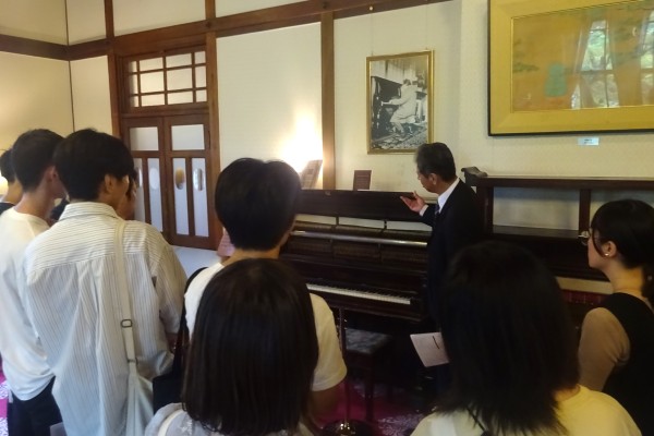 次に訪れた奈良ホテルは、本館の建築は辰野 金吾氏の設計により、国賓や皇族の宿泊する迎賓館に準ずる施設として誕生しました。「関西の迎賓館」と呼ばれ、和洋折衷の佇まいが魅力を醸し出しています。ブランドアンバサダーの藤田 昌宏氏より、アインシュタインやオードリー・ヘップバーンなど国内外の方々が宿泊したホテルの歴史、上村 松園の作品など美術品や調度品、ホテルの宿泊客の最近の動向などの説明とあわせて、ホテルの仕事や大学での学びに関するアドバイスもいただきました。