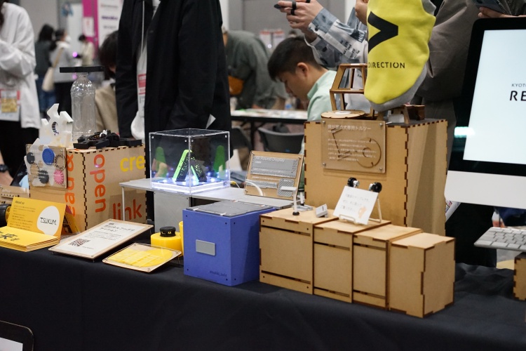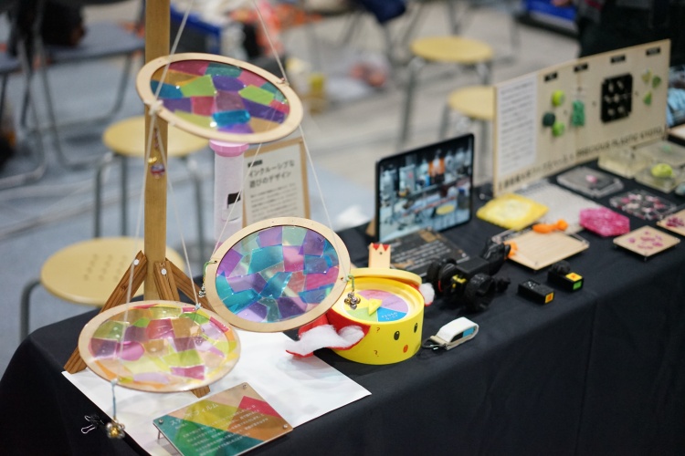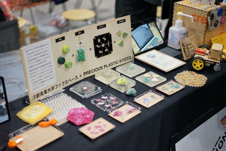 ファブスペースブースでは、授業「デジタルファブリケーション」で制作されたパーソナルファブリケーション作品、PRECIOUS PLASTIC KYOTOと共同実施したレーザーカッター・光造形3Dプリンター型を用いた射出成形作品、インクルーシブな遊びのためのデザイン提案、プログラミング教育用教材のほか、デジタル工作機械の特徴を学ぶ体操など学生主体で作られた作品の展示を行いました。