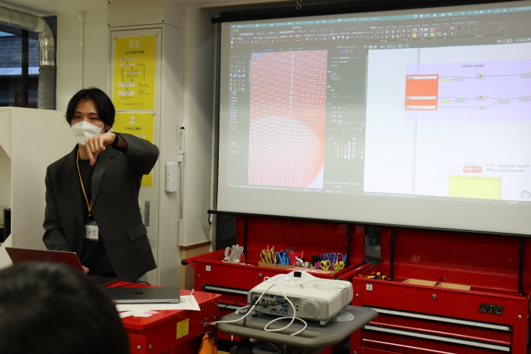 情報理工学部 伊藤 慎一郎 准教授よりデジタルファブリケーションについてのレクチャーを受けた後、3DモデリングすることができるWebアプリ「Tinkercad」を使用し、ネームプレートのデータ作成を行いました。
