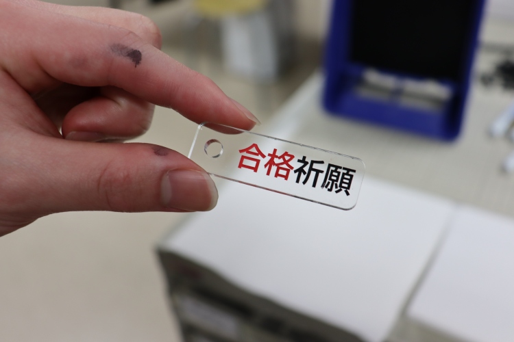 次に、思い思いの一言コメントをレーザー彫刻したアクリルキーホルダー作りを行いました。
