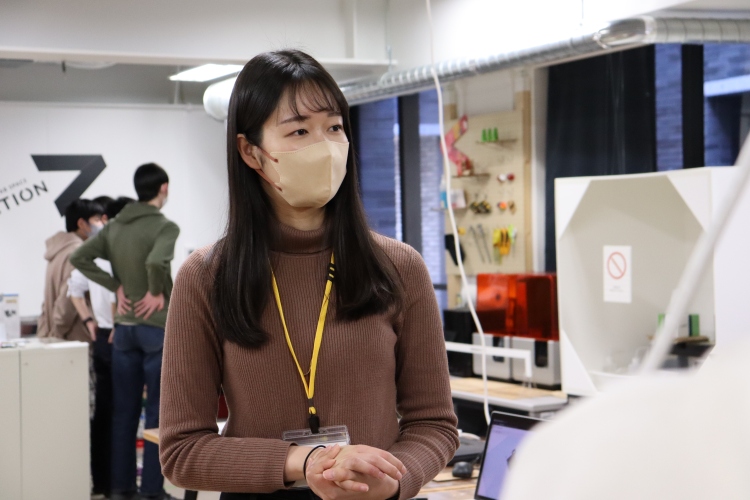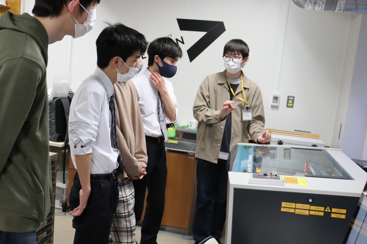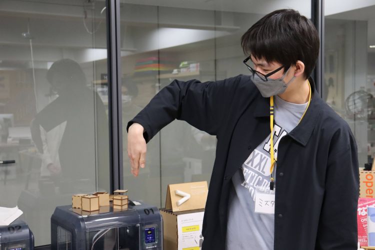 デジタルファブリケーションを学んだ学部1年次から大学院生までがサポートスタッフとなり、各種機器操作のほか、授業や研究で作った制作物の紹介や高校生からの質問に回答しました。